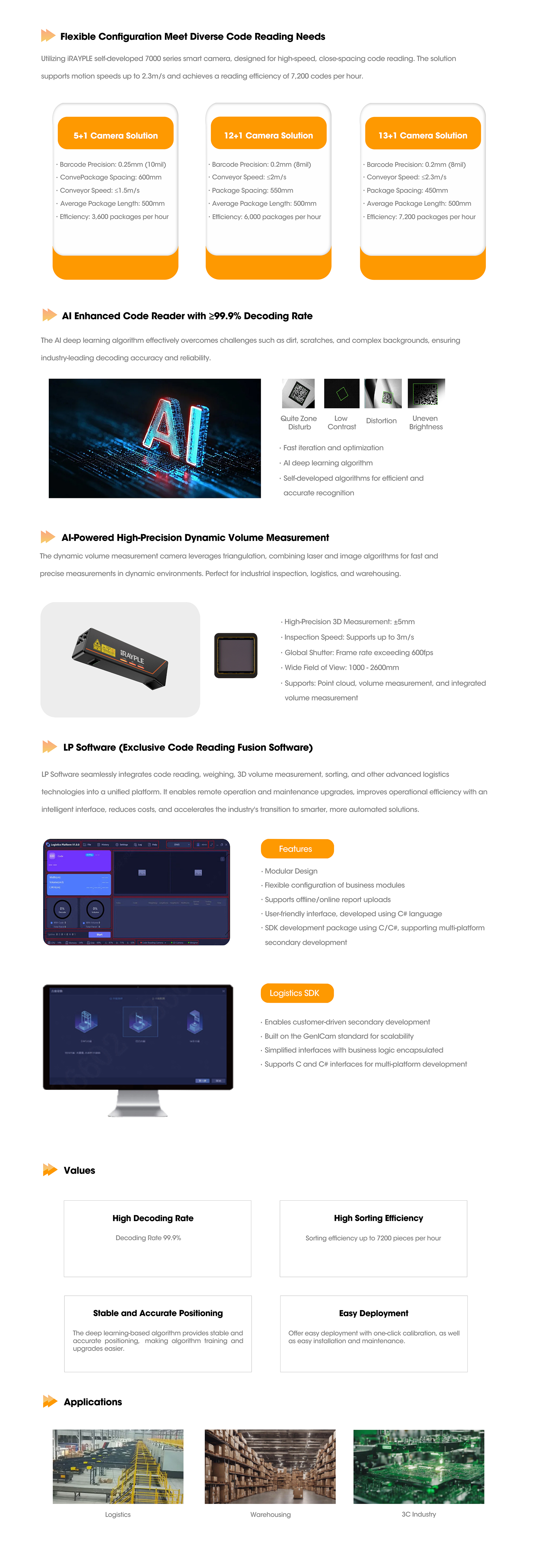 iRAYPLE High-speed Six-side DWS System employs multi-directional scanning to deliver 360° package recognition, enhancing sorting accuracy and efficiency. Designed for industries such as 3C electronics, logistics, packaging, lithium batteries, and photovoltaics, it fulfills the demand for fast, precise scanning and sorting.